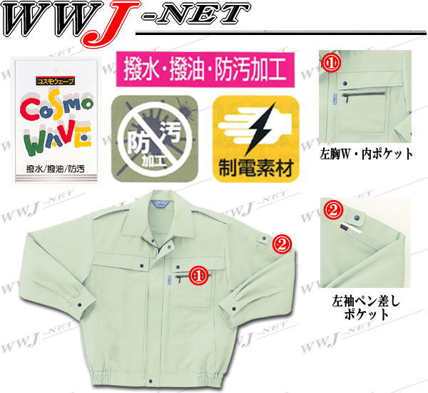 制電交織ツイルに撥水・撥油・防汚加工を加えた多機能ウェア。